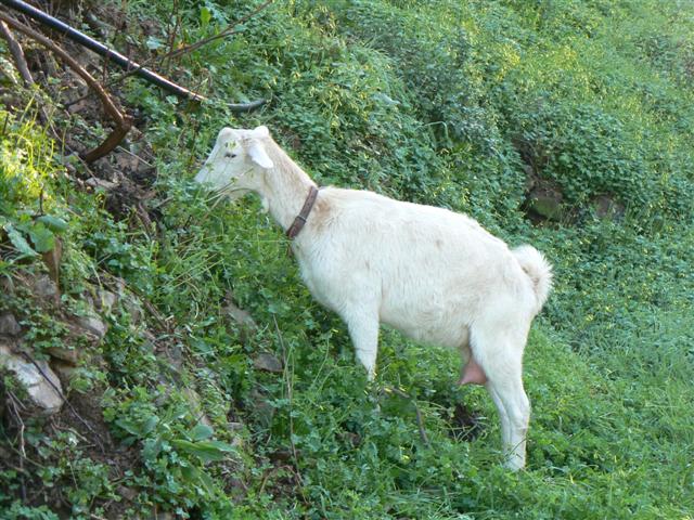 We support the pile with a construction as you can see in the picture above. The terras above the heap is used to pour the goats place litter into the construction. The construction is made of concrete reinforcement iron rods hammered in the ground in a semicircle. Then we fix ( with tight ribs) a piece of goat fencing in the inside, and on the inside of the goat fencing we fix a piece of rabbit wire. This way the compost stays inside.